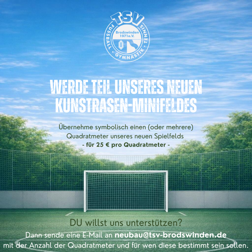 Wir bauen ein Kunstrasen-Minifeld! 27. Februar 2026 Allgemeines Du willst uns unterstützen? Dann Sende eine E-Mail an neubau@tsv-brodswinden.de mit der Anzahl an Quadratmetern und für wen diese bestimmt sein sollen.